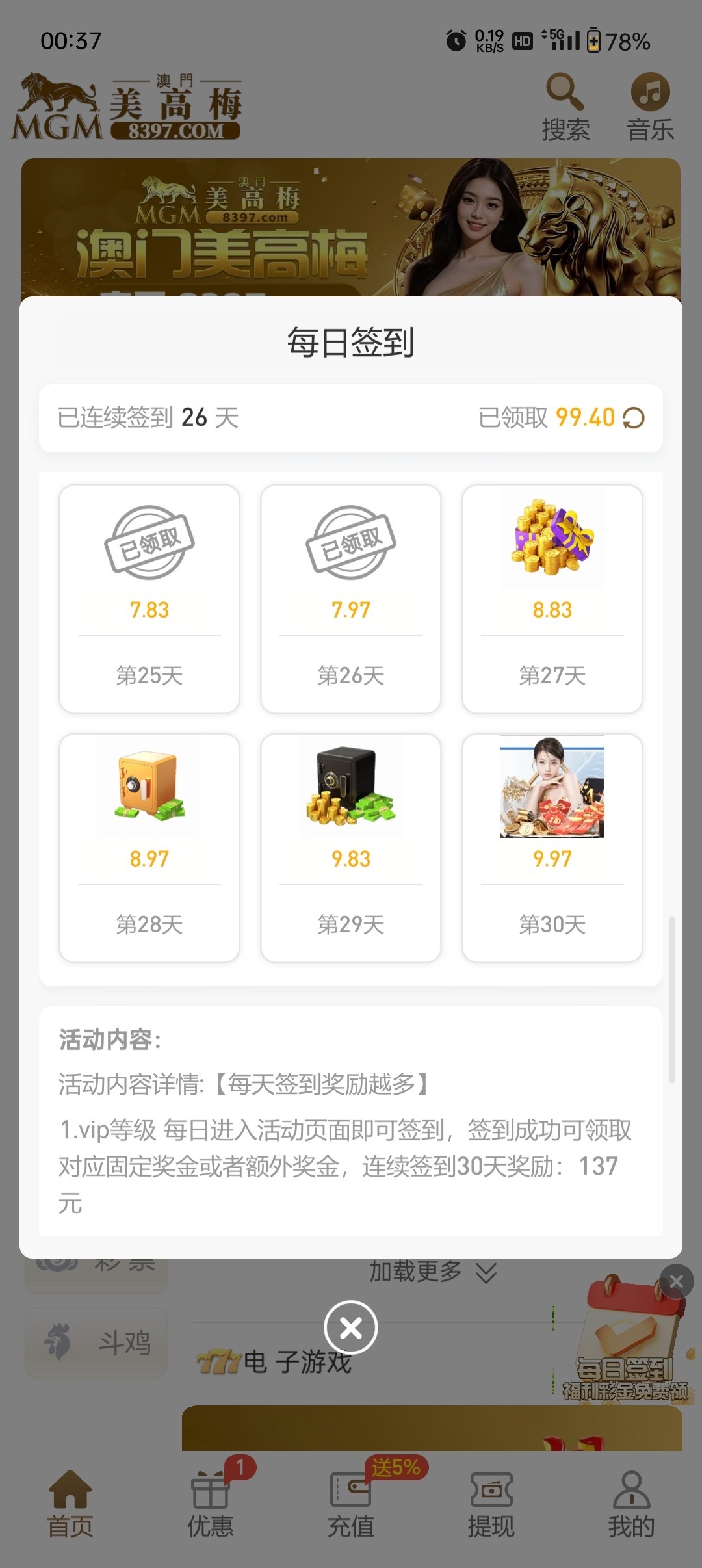 参加了以小博大,没打出来;后面充了几次几百,然后就一直弄这个签到了,这个签到出款了五六次吧,提现是稳的。主页右下角签到入口。每天过了零点就可以签到,刚开始金额是小的,越后面越大,也可以存起来后面打。(中间不要断签就行,不然又要重新开始签到) 我都是打pg出的,麻1有点小水。 有时间的老哥可以留意一下这个。