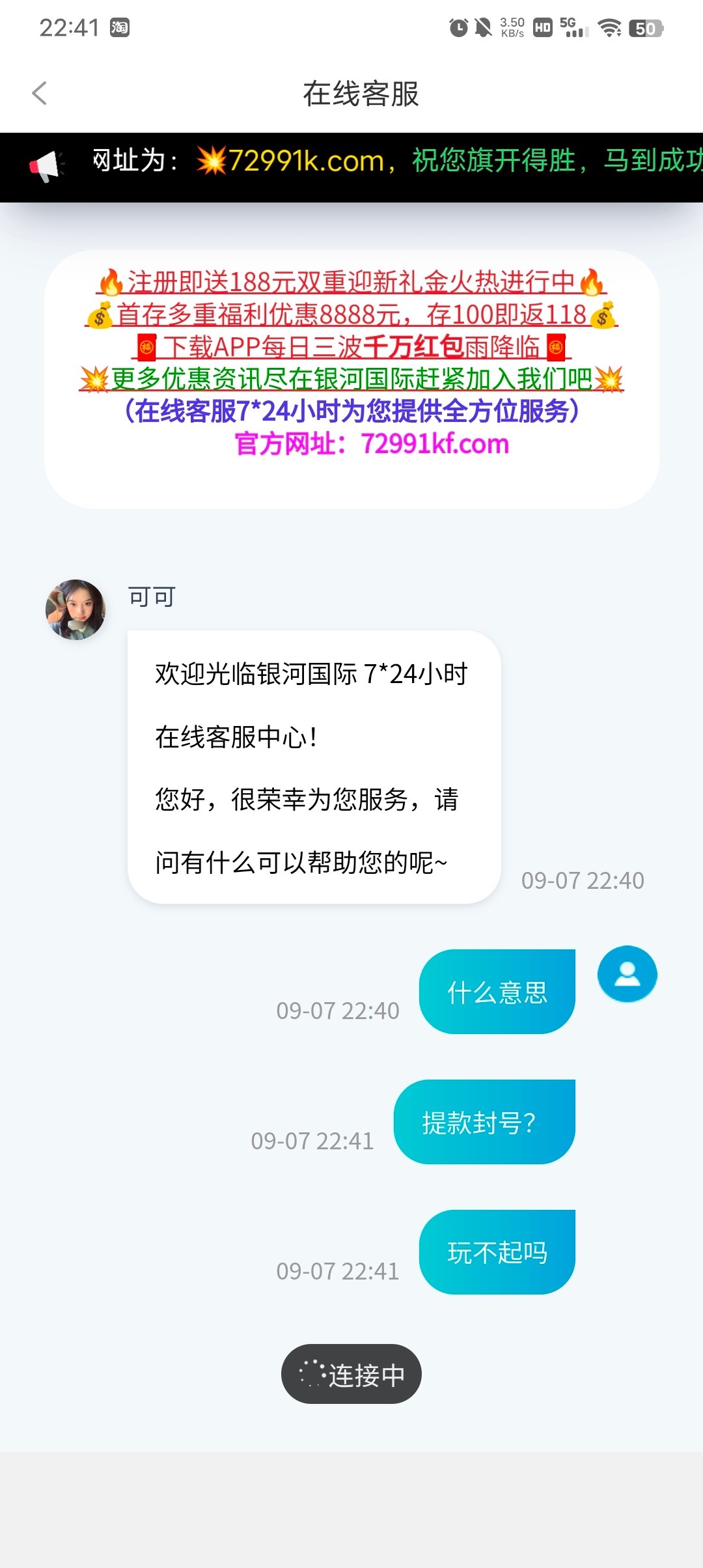 电话特邀送了15打到600,充了50说违规投注罚水10倍,打够了打到930提款封号,找客服也直接关闭对话