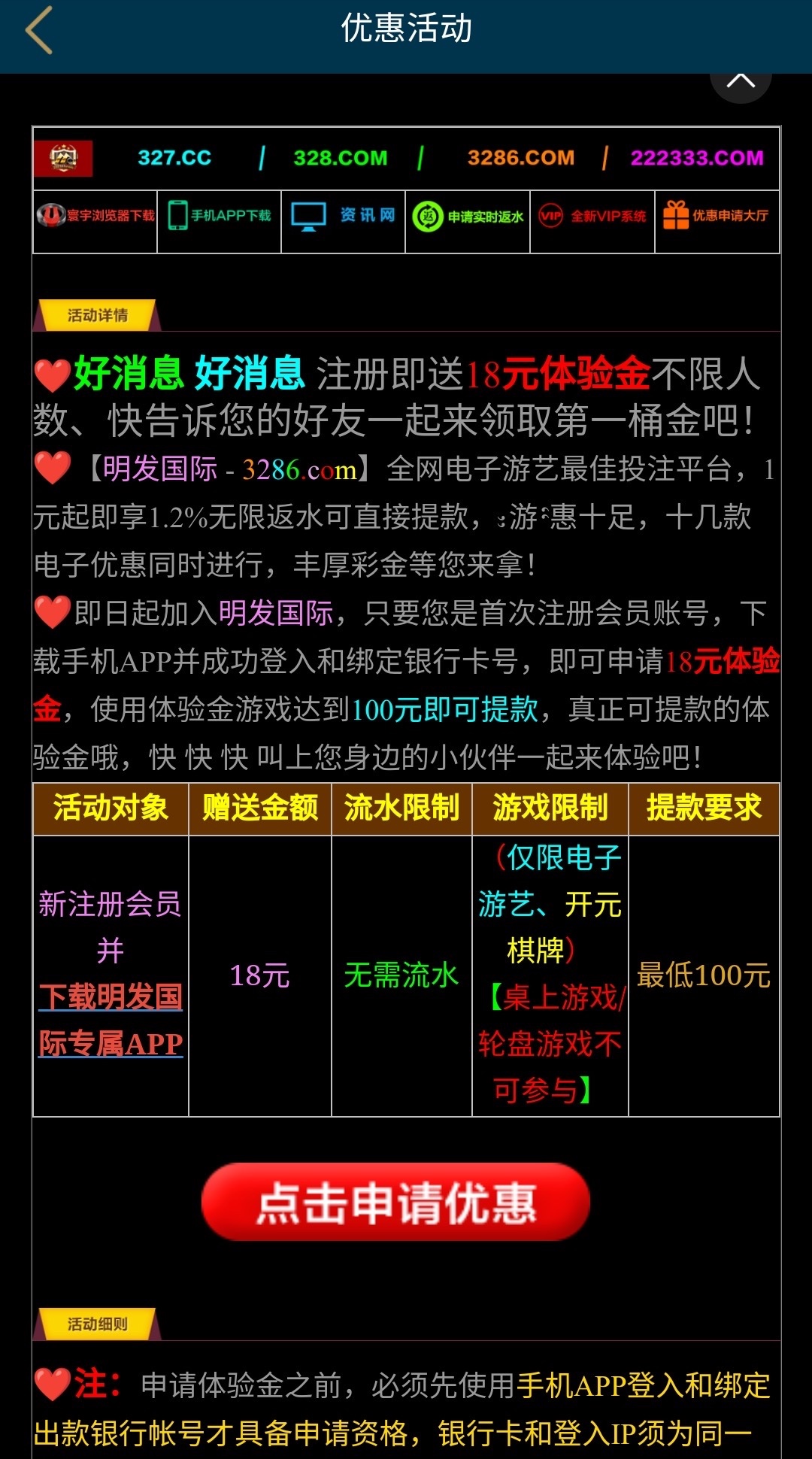 假的,这个是老黑台子了,记得还有一个18送38,这个平台也是秒拒,自己存款玩cq9洪福齐天18块钱打到200不给出款直接人工扣除了给我说我套利退回18本金,18块钱还不让取款最低100取款他妈的典型的没格局的野鸡台老板没有实力
